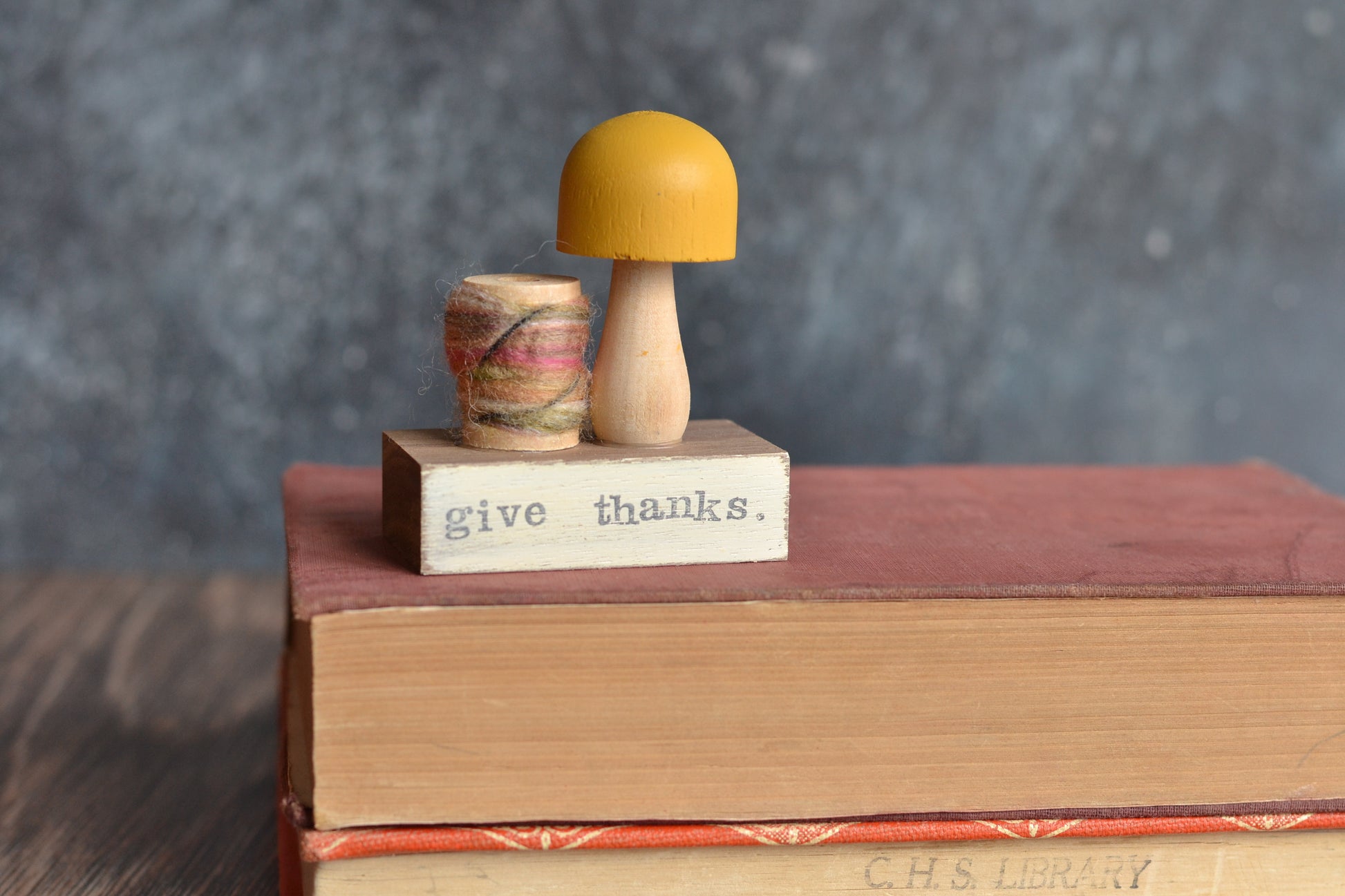Autumn themed yarn spool + painted mustard mushroom + hand stamped words.
