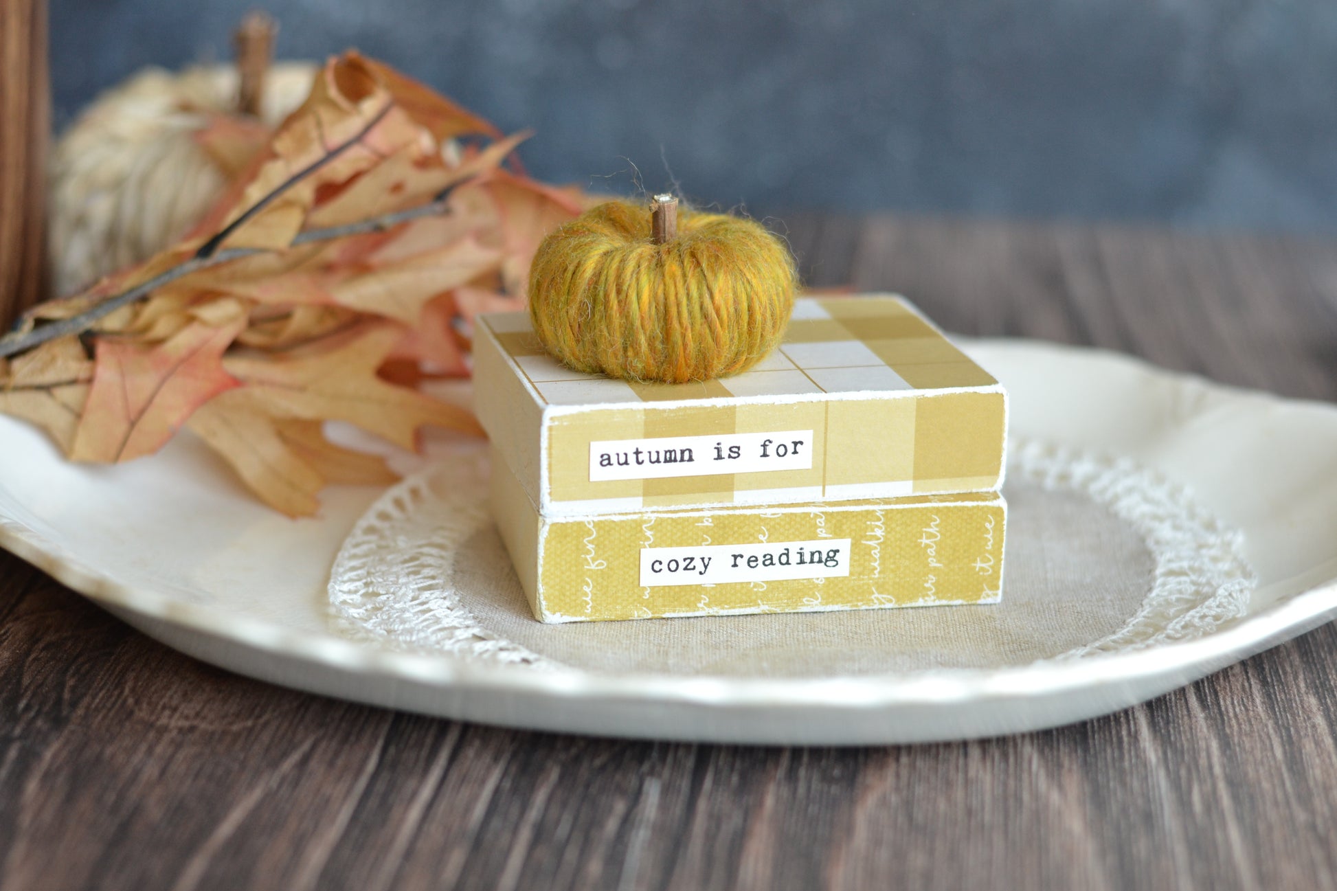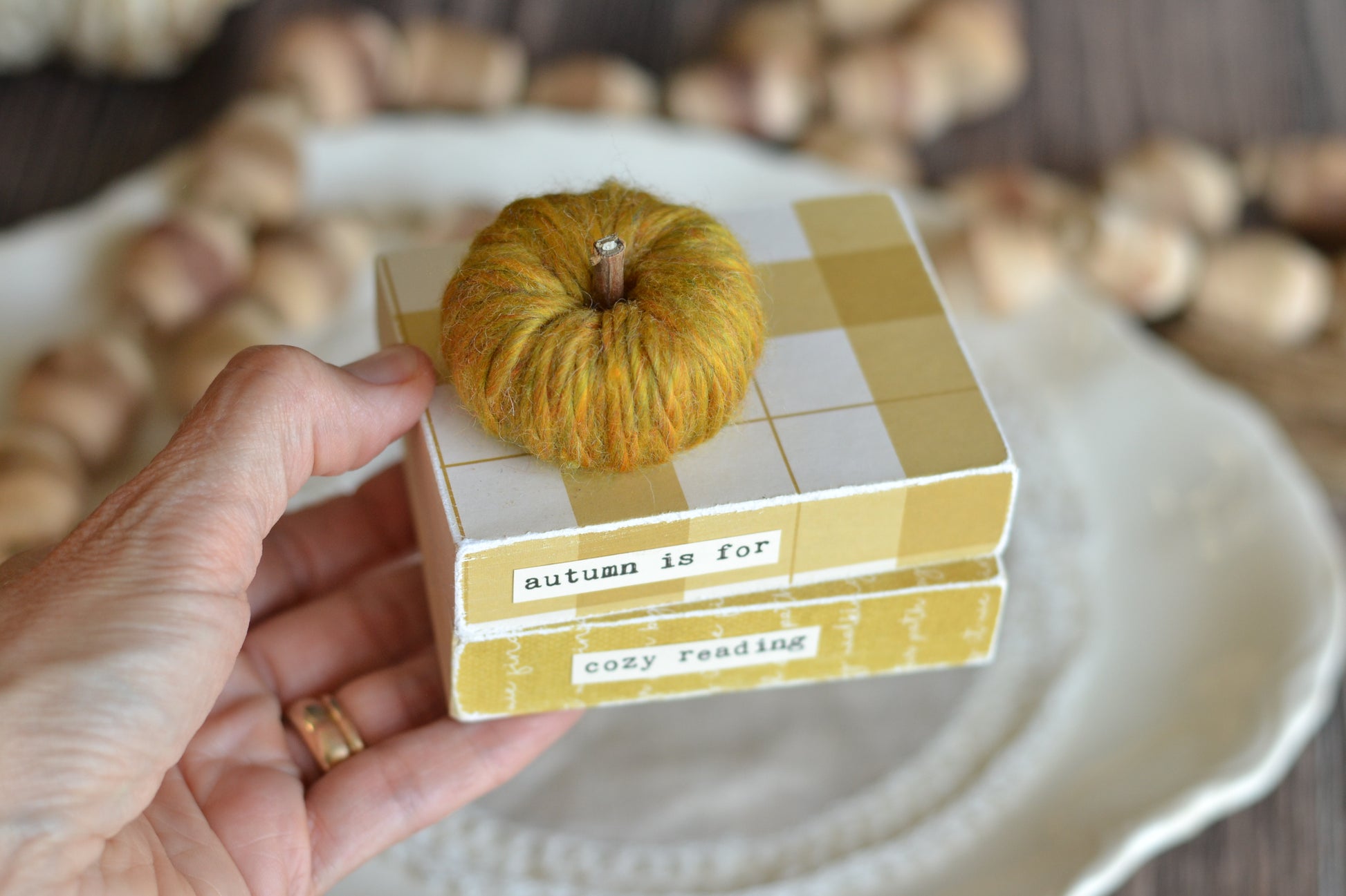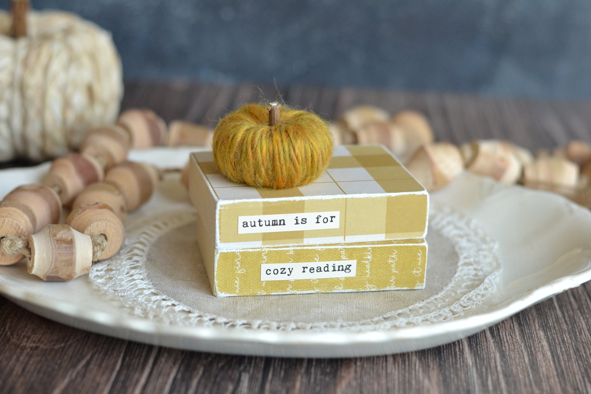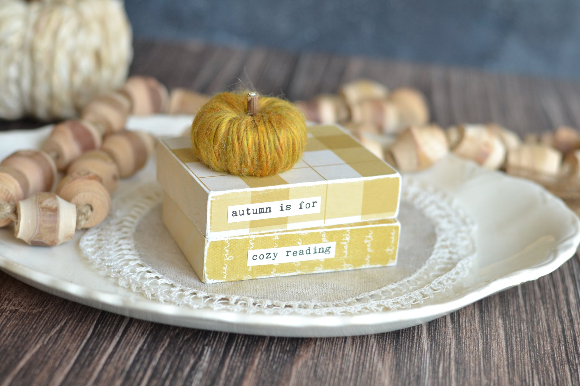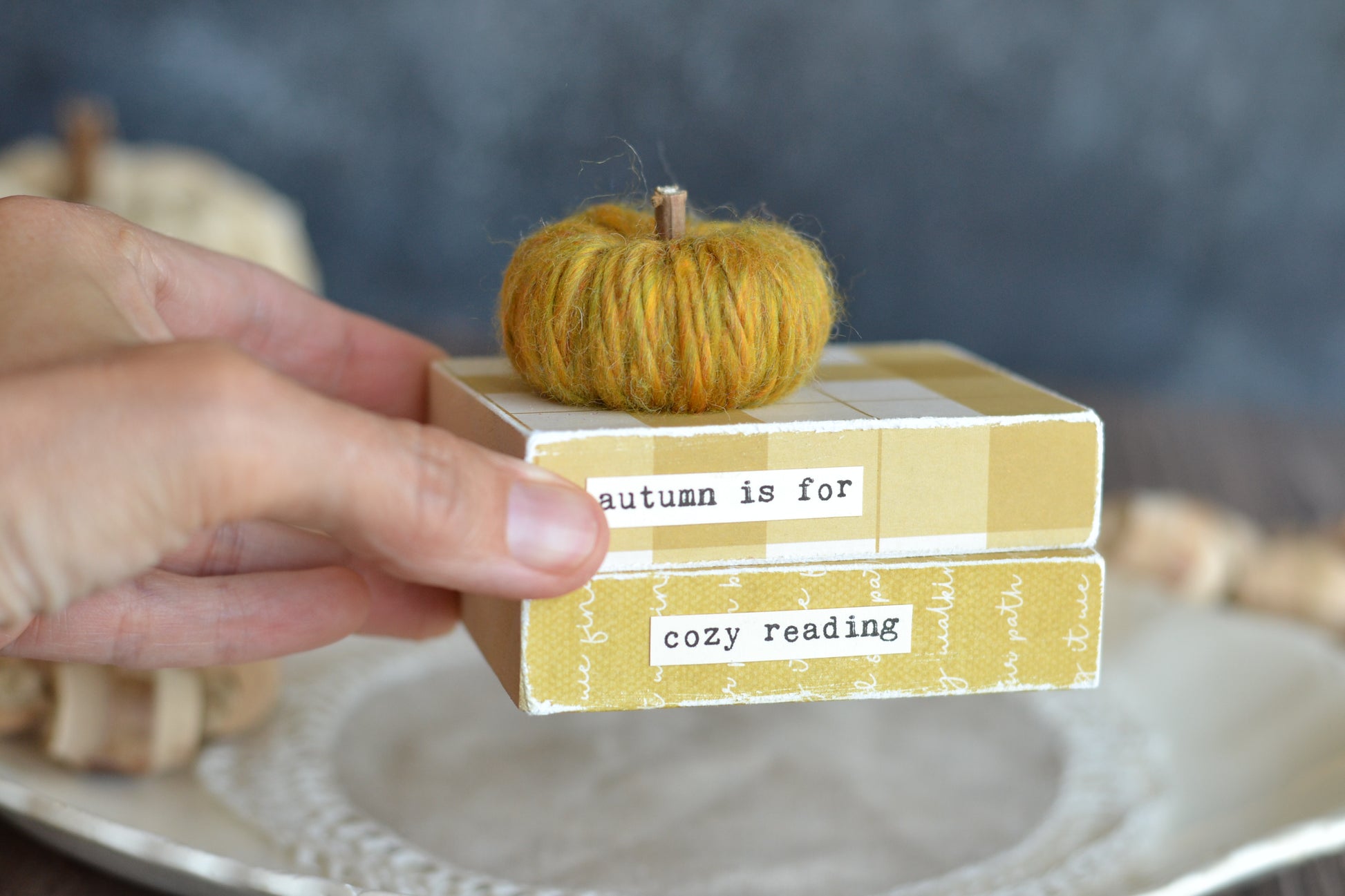 This cute wood faux book stack is just the best fall decor. A felt pumpkin, an acorn, hand stamped word and warm fall colors. Perfect for your fall shelf.