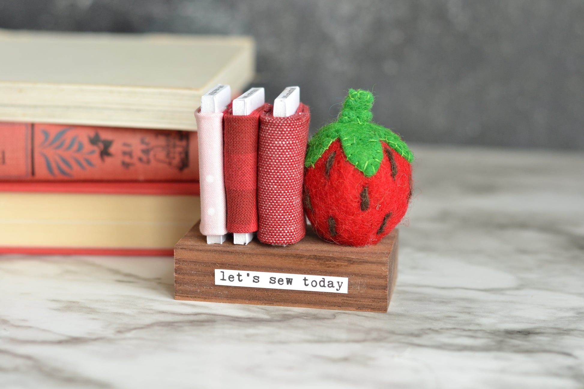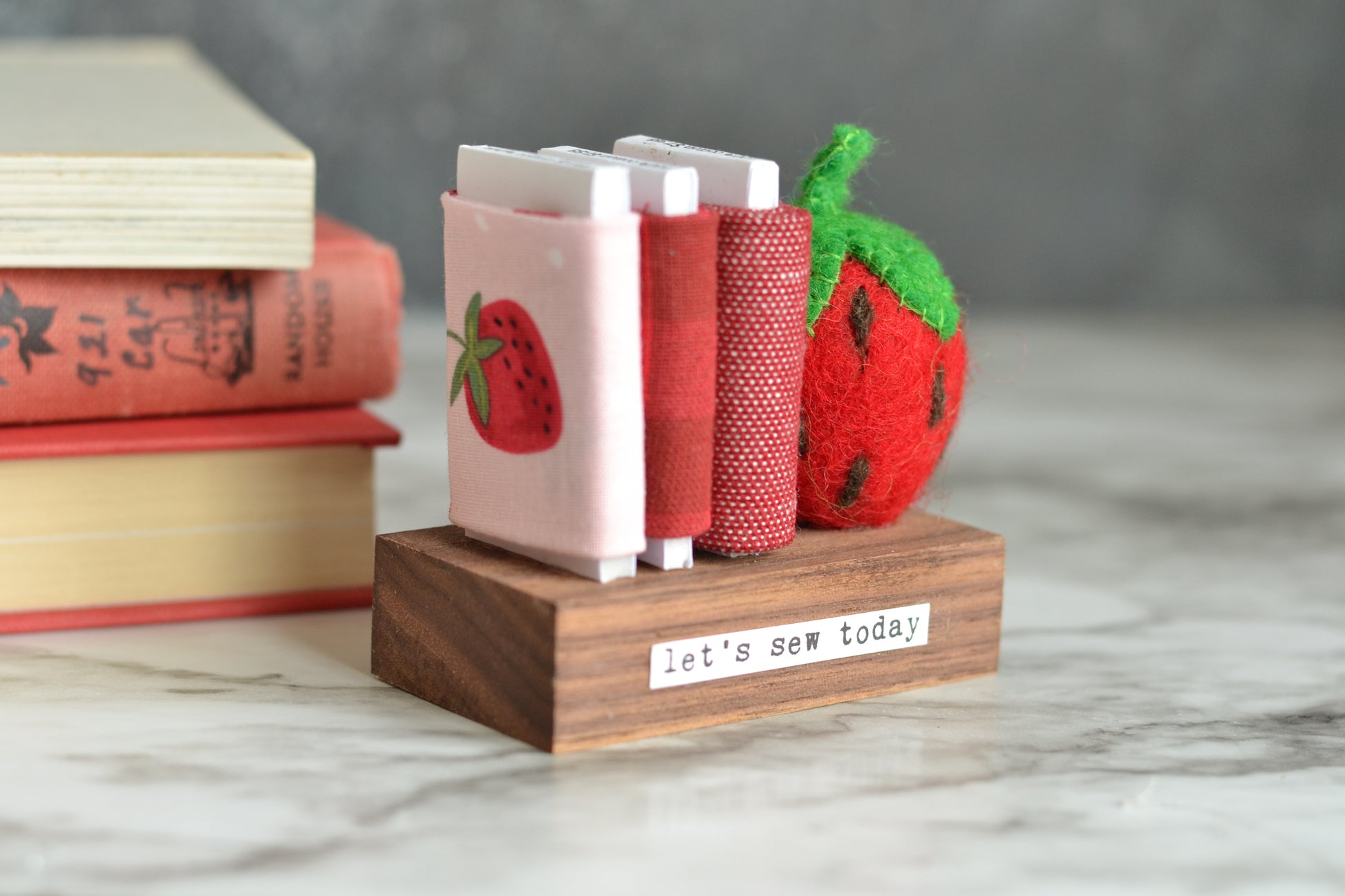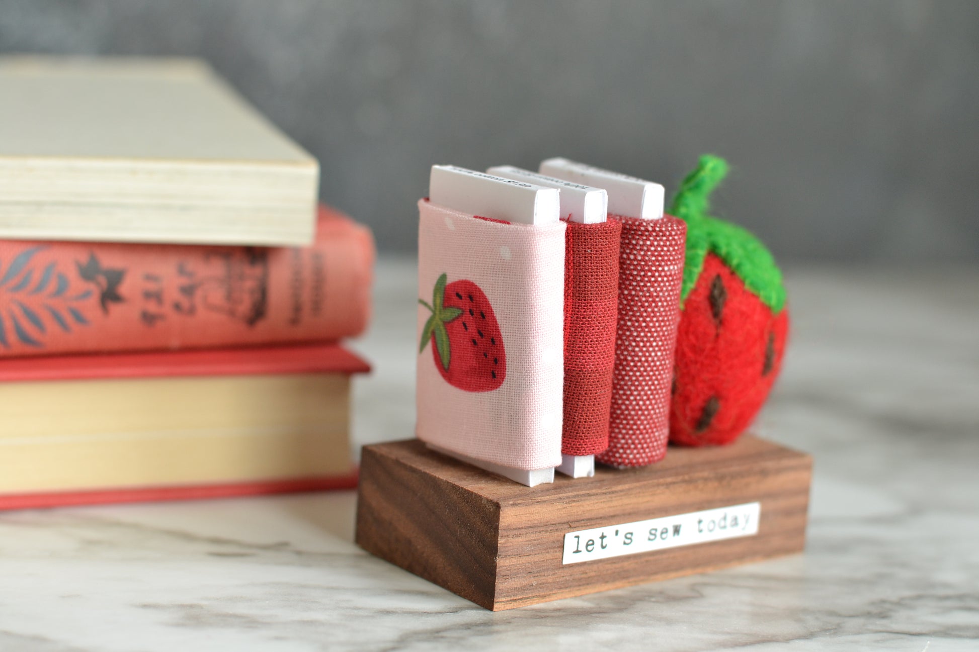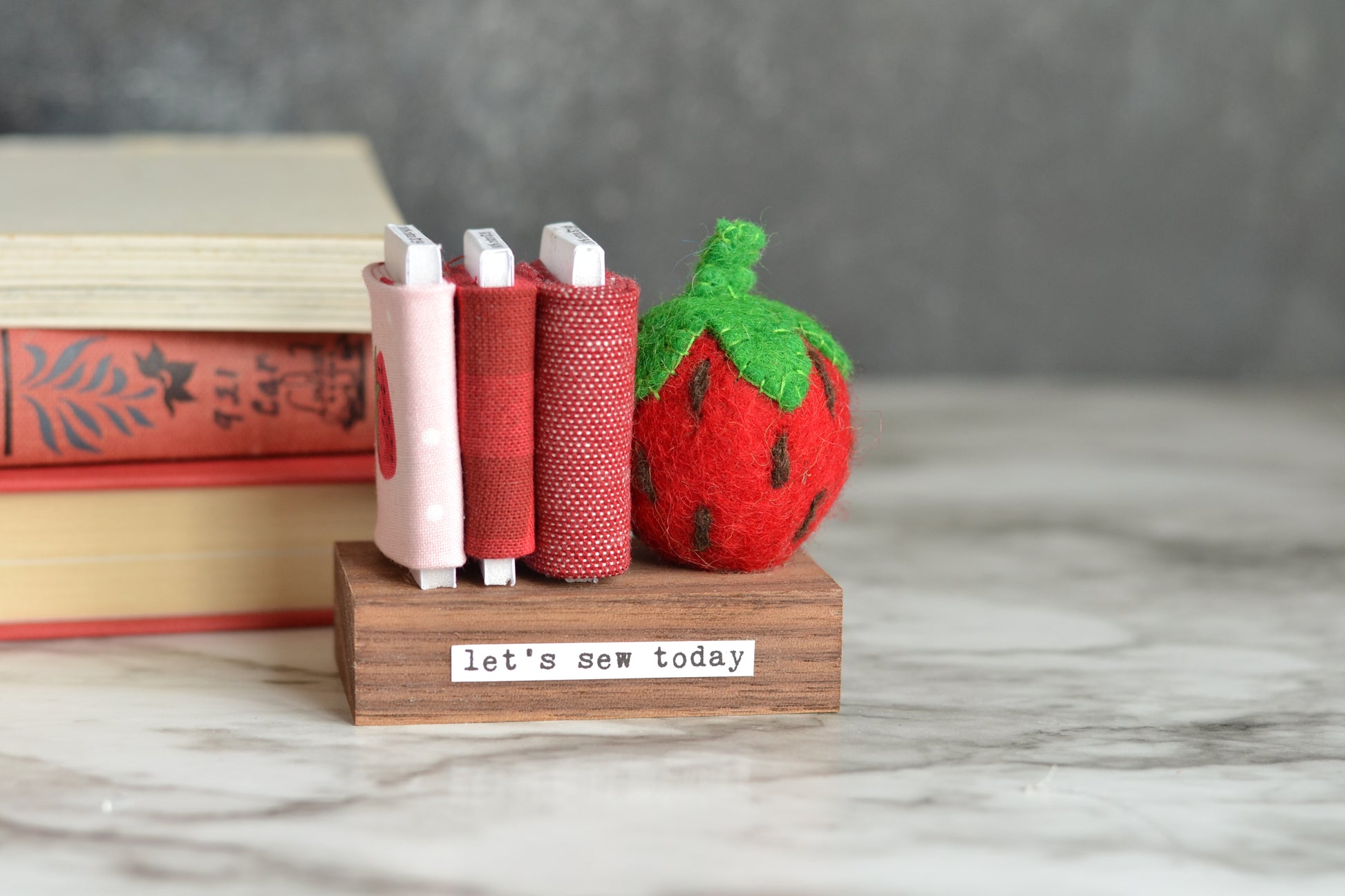 Mini fabric bolts with a strawberry - let's sew today