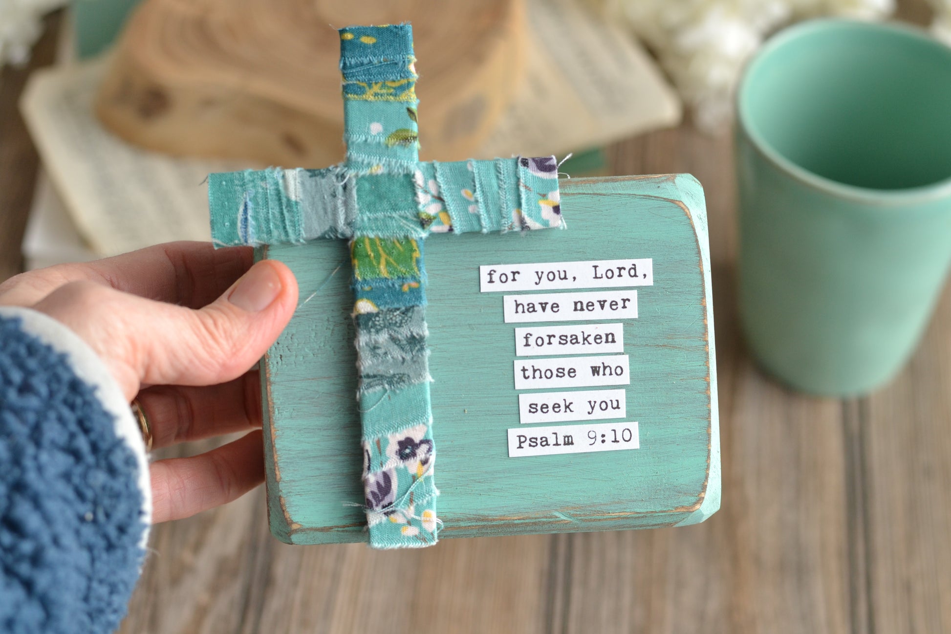 Blue Psalm 23 Wood Sign with Fabric Wrapped Cross - C19