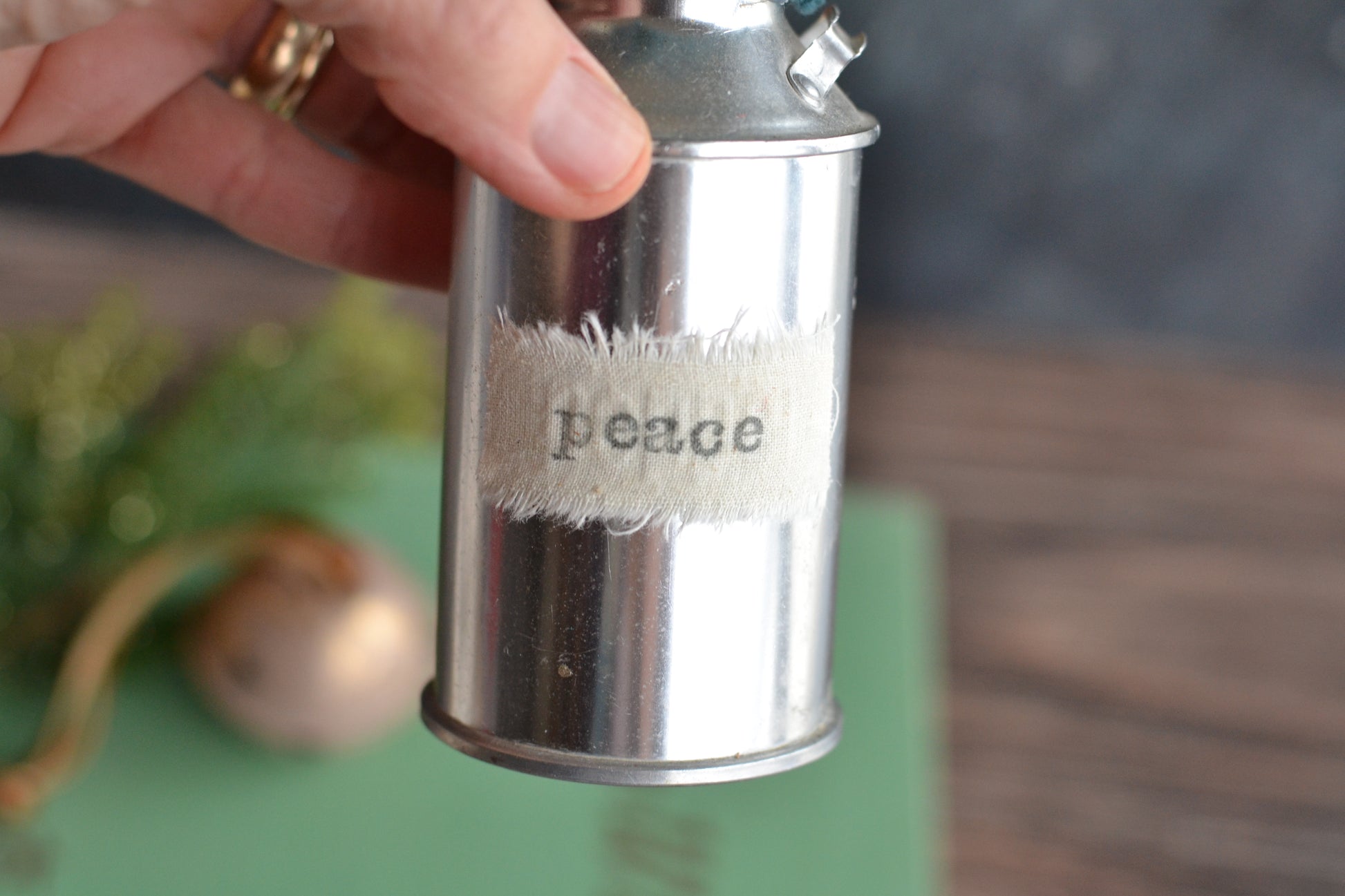 Such a festive Christmas sign for your shelf or tiered tray with a unique wrapped tree in a mini vintage-looking metal canister.